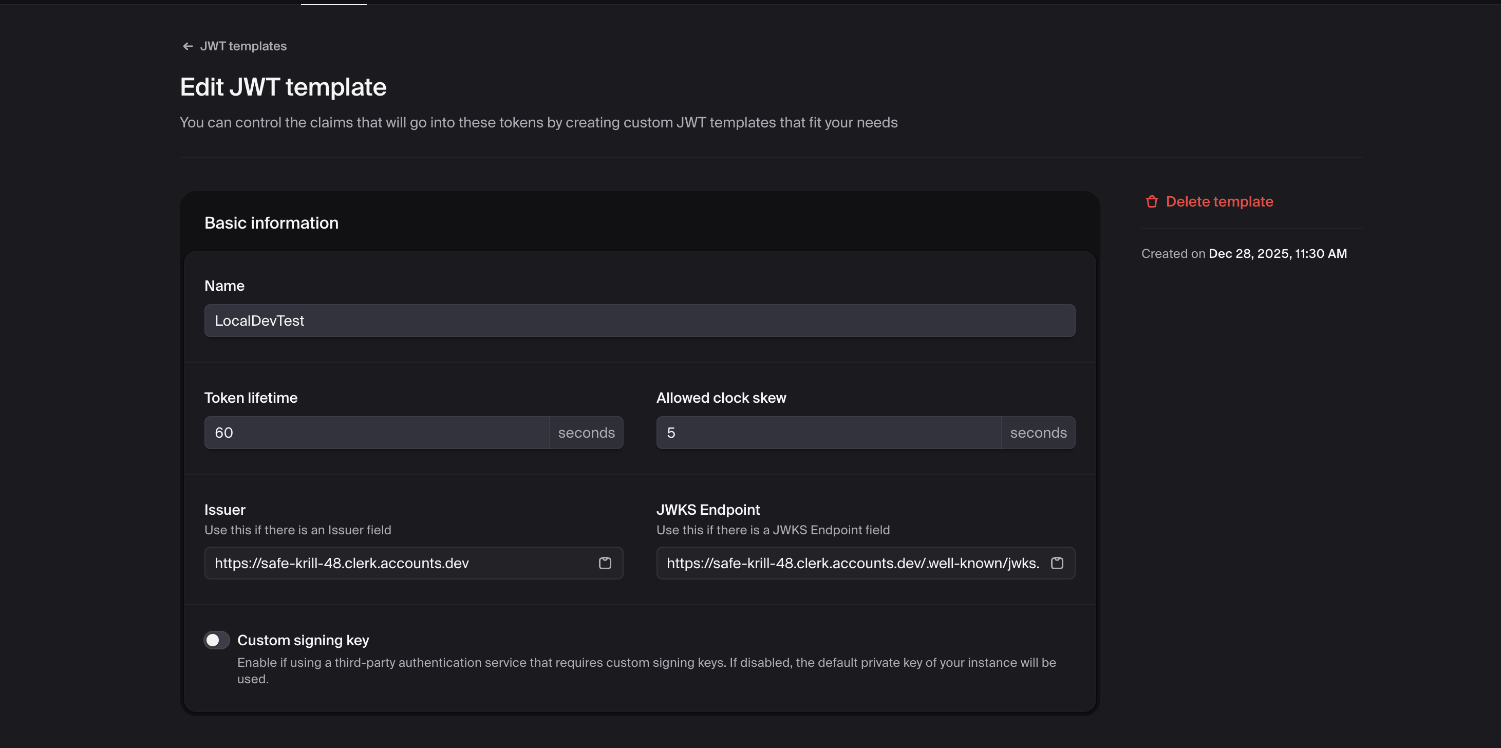 - Token Lifetime: 60–300 seconds. Shorter is safer; longer reduces Clerk API traffic.