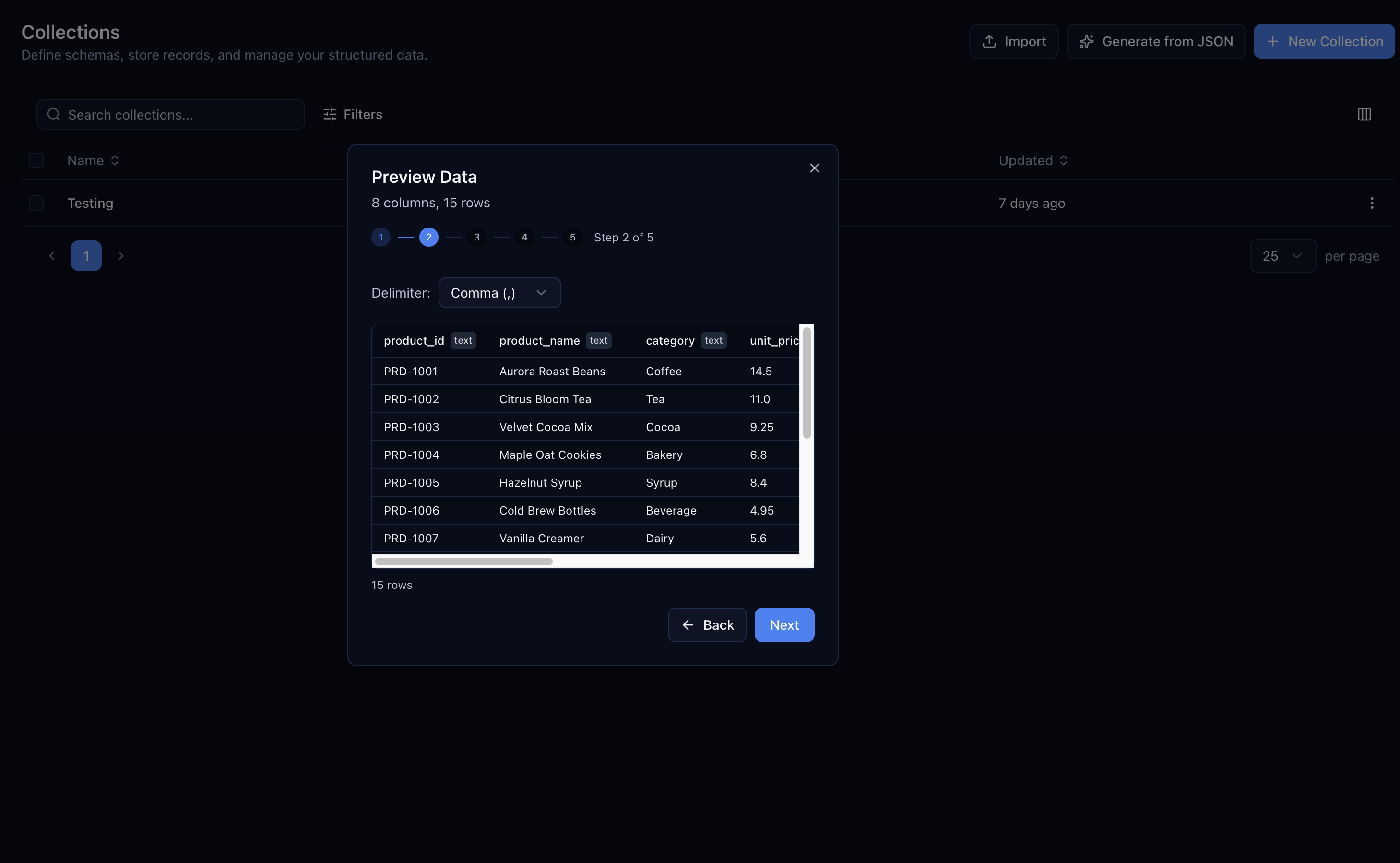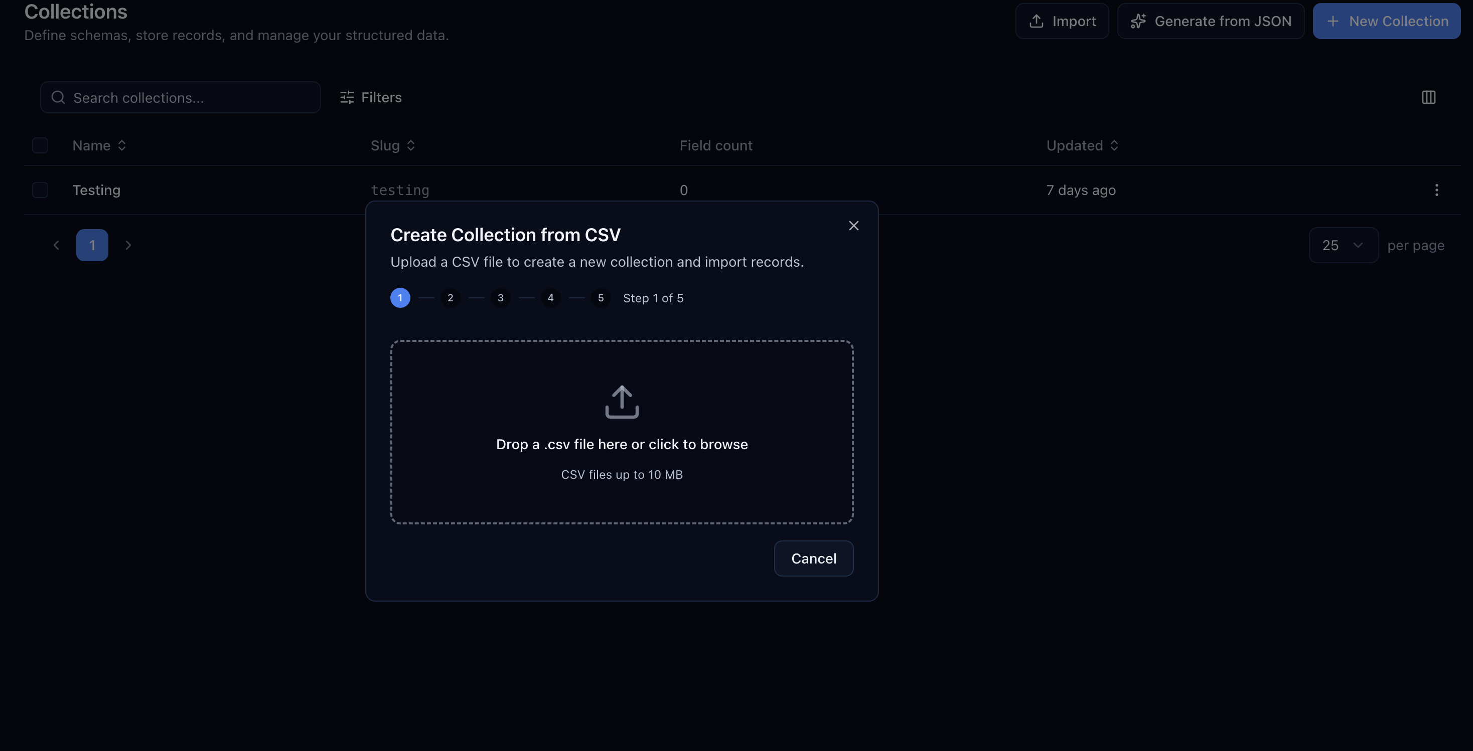 From the Collections page, click Import and select Import CSV. The rest is a guided 5-step flow.