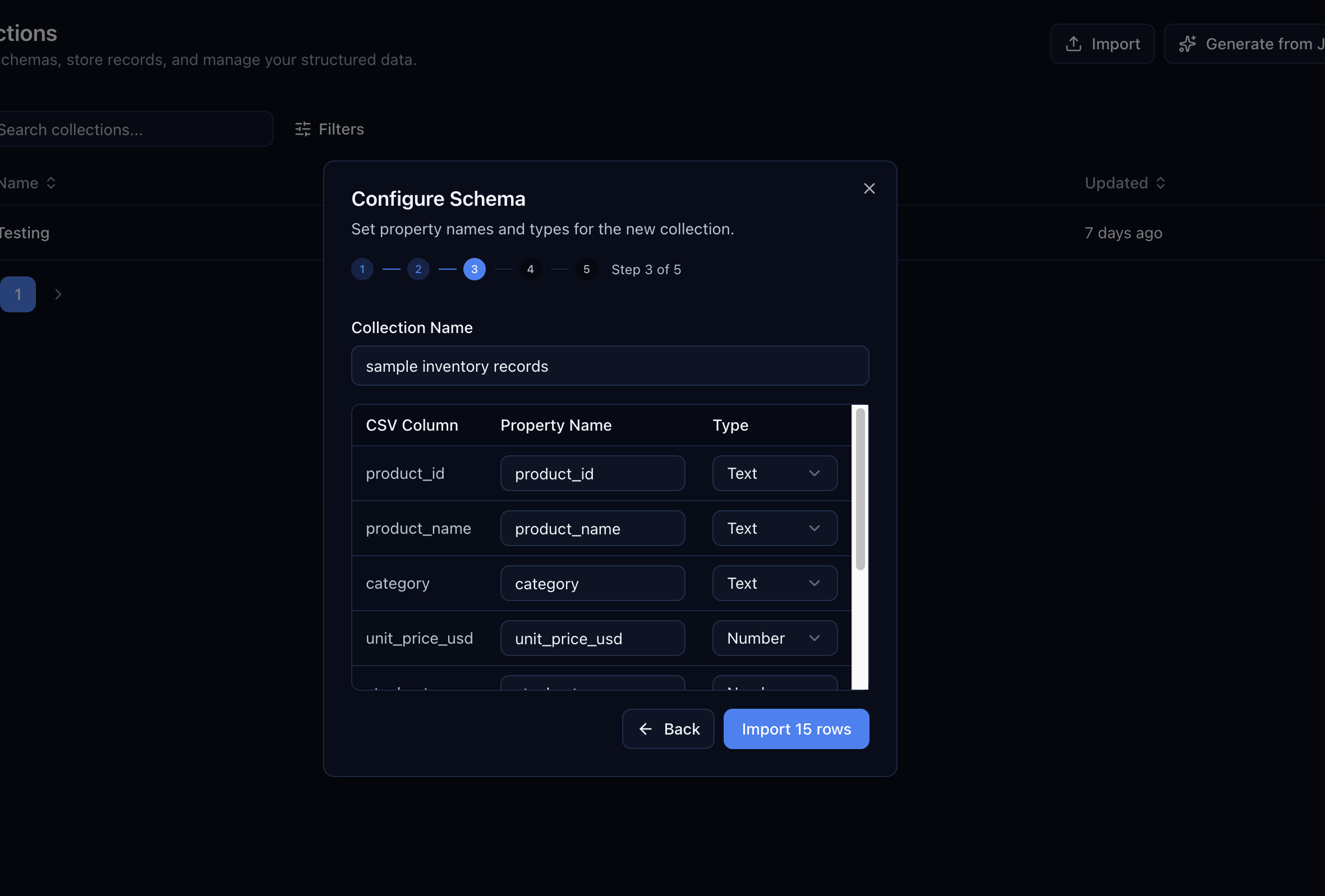 CSV import also works with existing collections. Instead of creating a new collection, you can import records into one you've already set up. The column mapping step matches CSV columns to your existing properties, and type validation catches mismatches before anything is written.