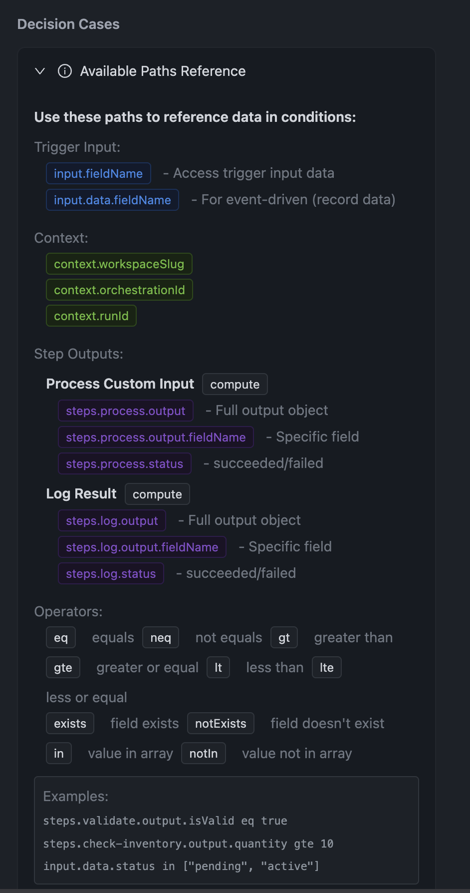 steps.stepId.output— Full output objectsteps.stepId.output.fieldName— Specific fieldsteps.stepId.status— succeeded or failed