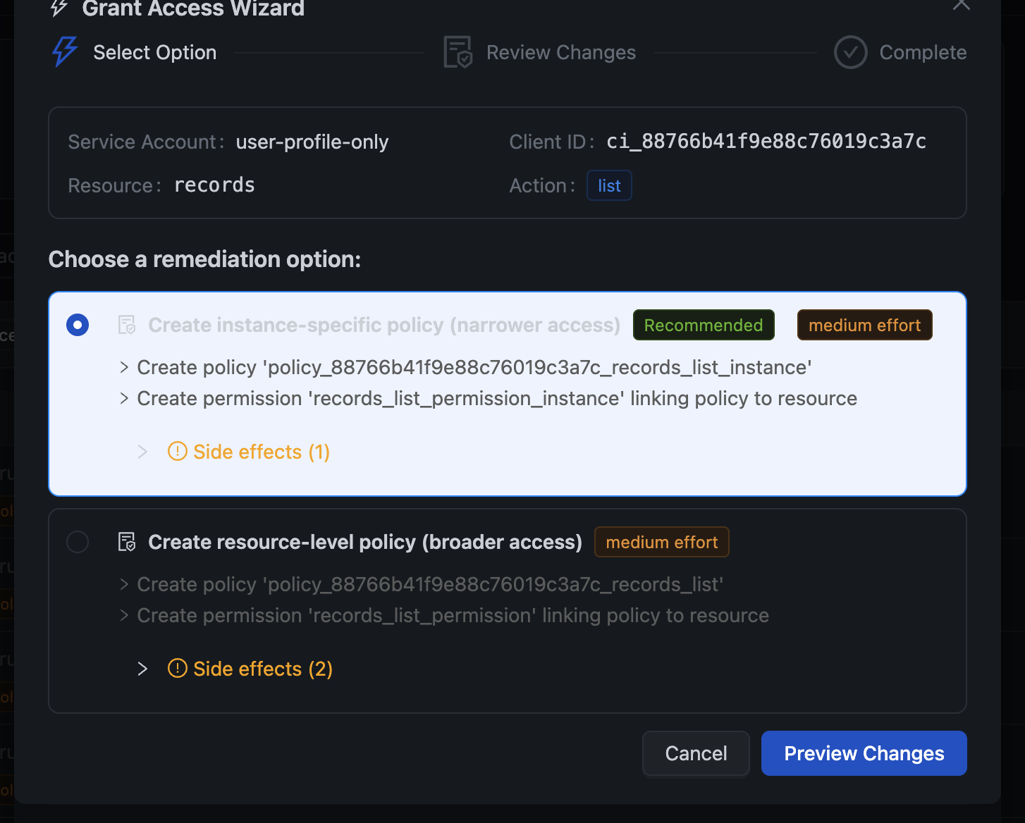 This is where it gets really powerful. When access is denied, you don't have to manually create policies and permissions. Click Fix Access and the Remediation Wizard guides you through granting access.