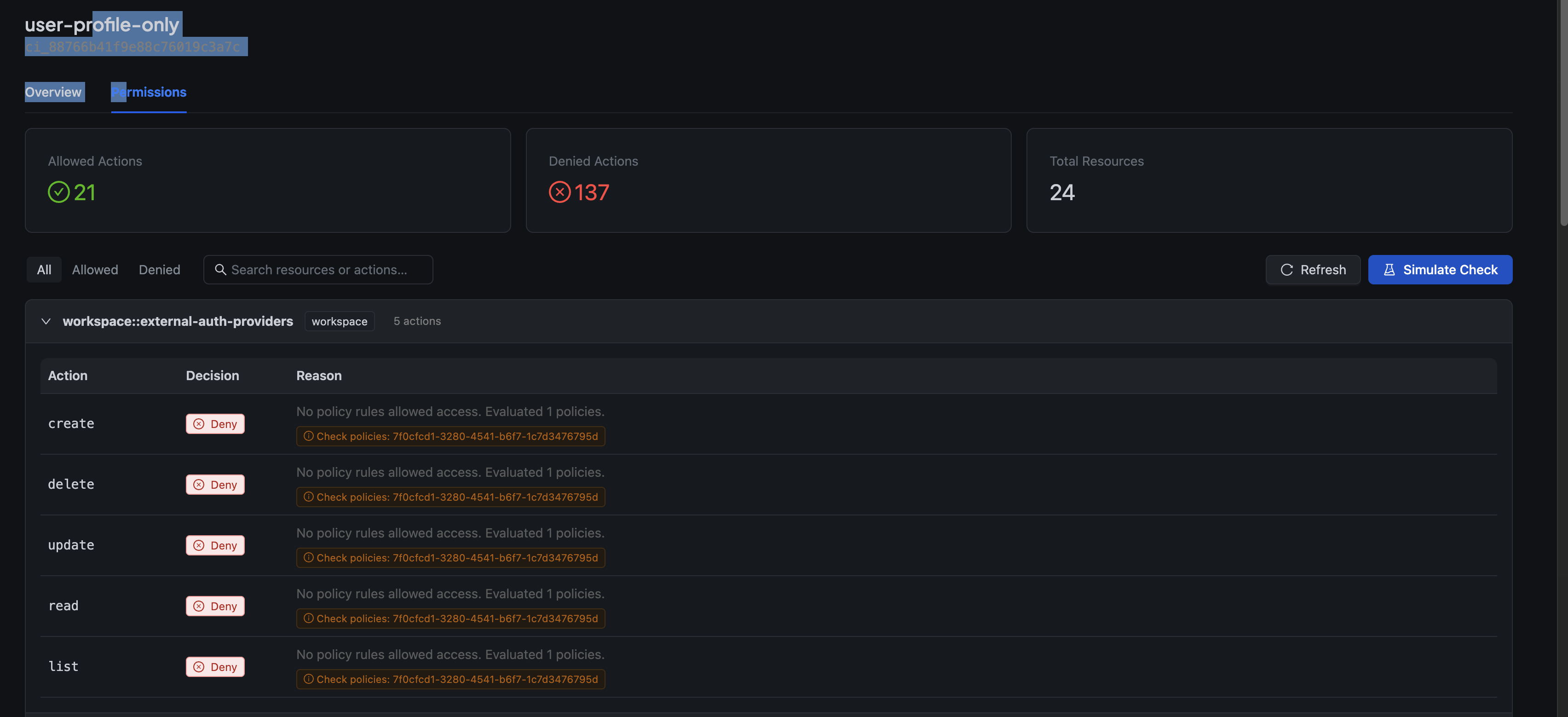 Each denied action shows the specific reason—whether it's a missing policy, a condition that didn't match, or a resource that doesn't exist.