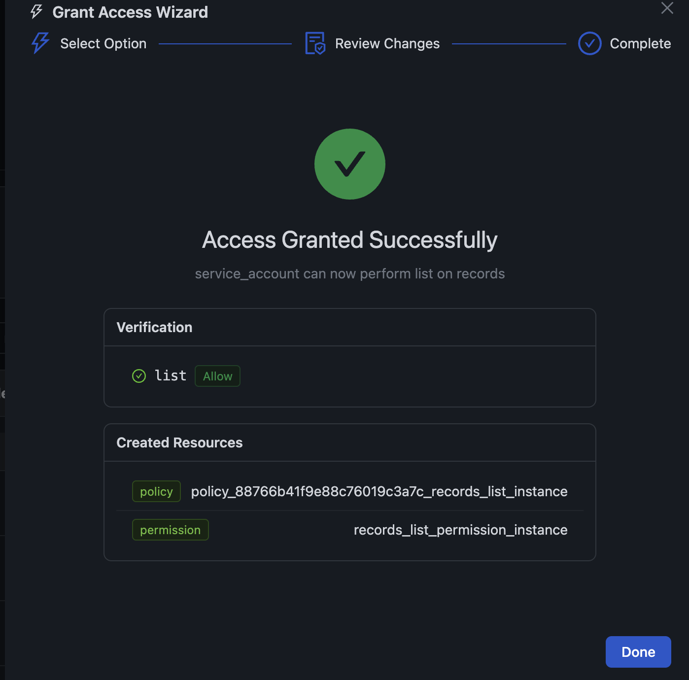 - Instance-Specific Policy — Grant access only to a specific resource instance (e.g., only the "customers" structure). This is the recommended option for least-privilege access.
