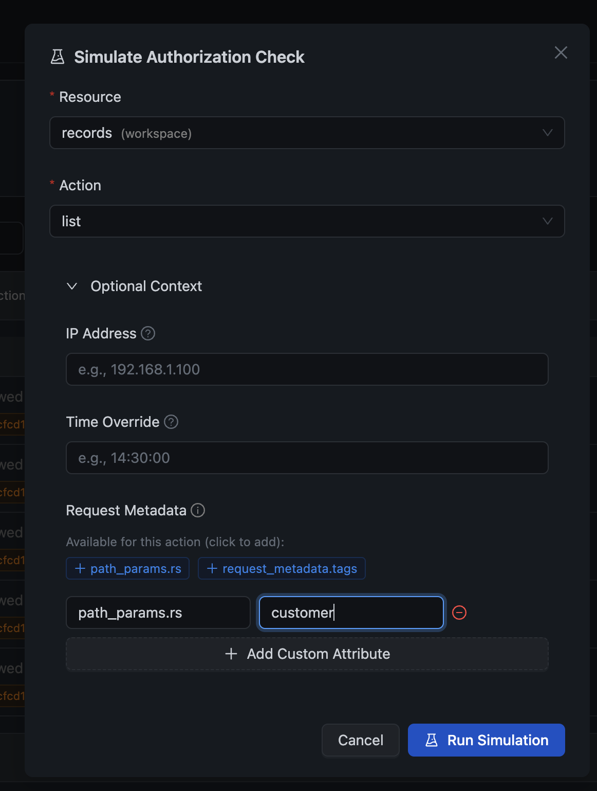 Sometimes you need to test "what-if" scenarios. The Simulate Check feature lets you test any authorization scenario with custom context: