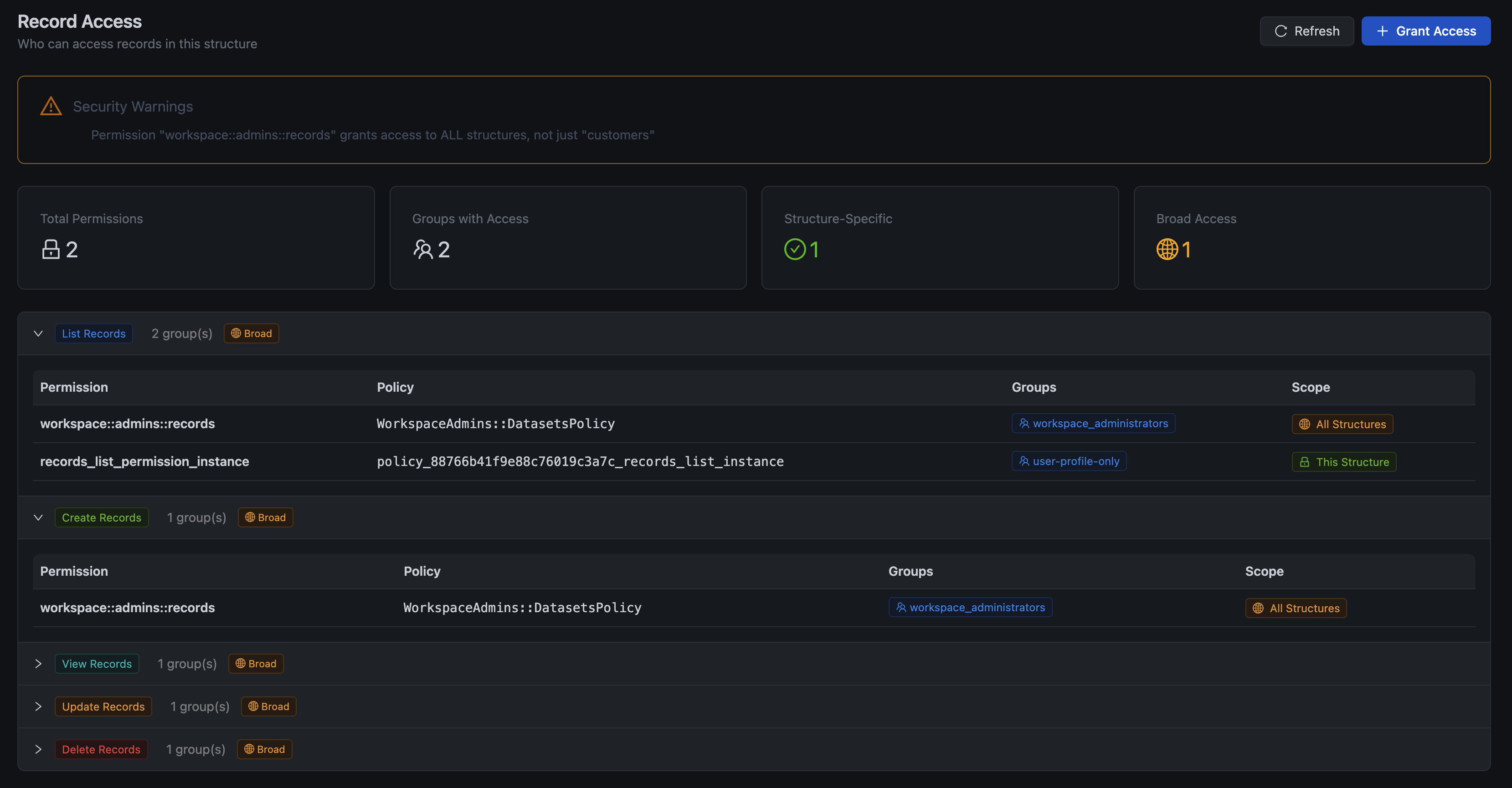 - Scope Breakdown — Structure-specific vs. broad (all structures) access