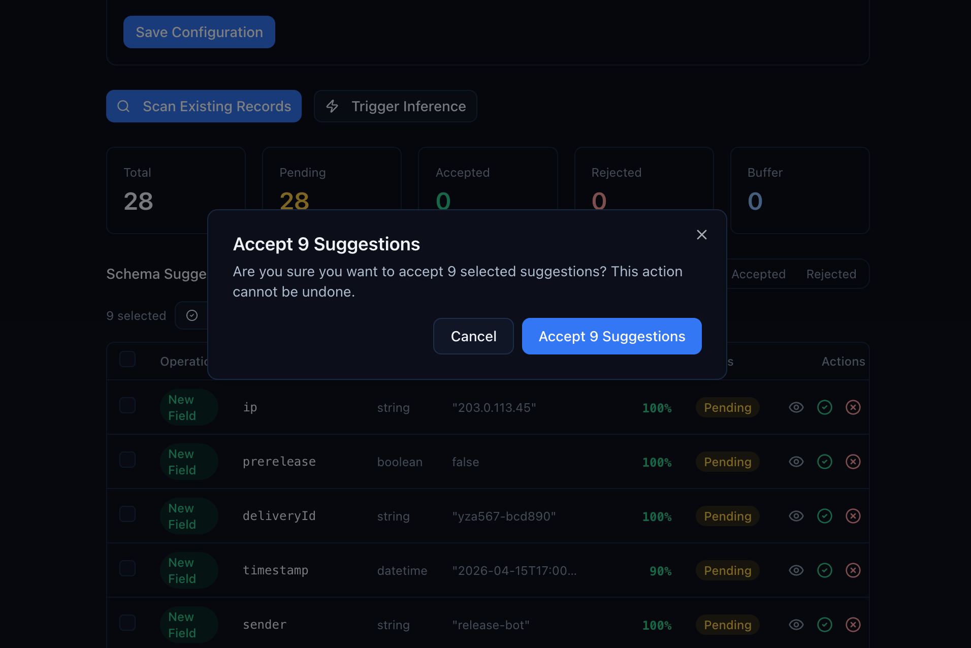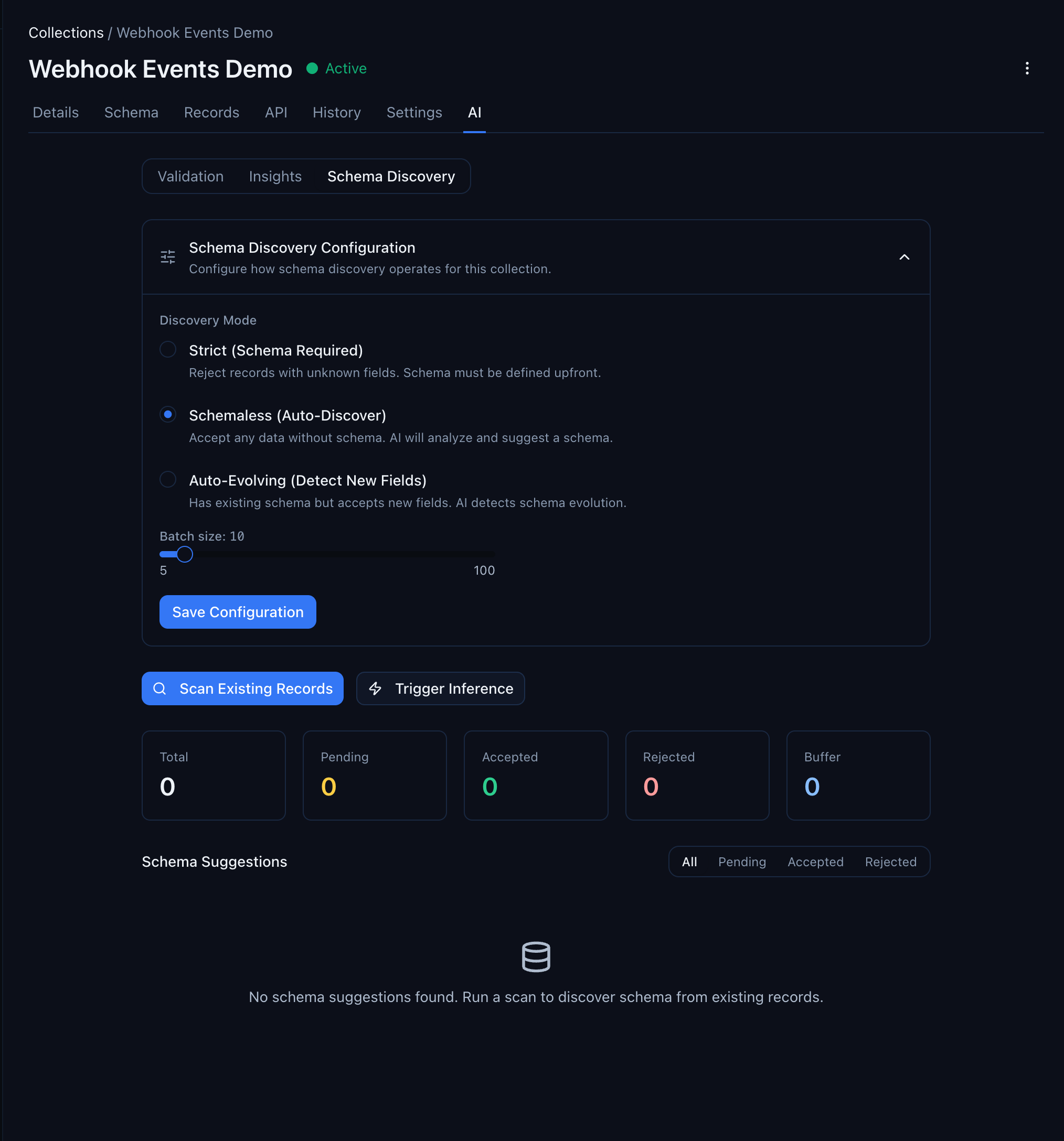 Automatic (buffer-based): In schemaless and auto-evolving modes, every new record is added to a buffer. Once the buffer reaches the batch size (default: 10 records), inference runs automatically and generates suggestions. You don't have to click anything — suggestions appear as data flows in.