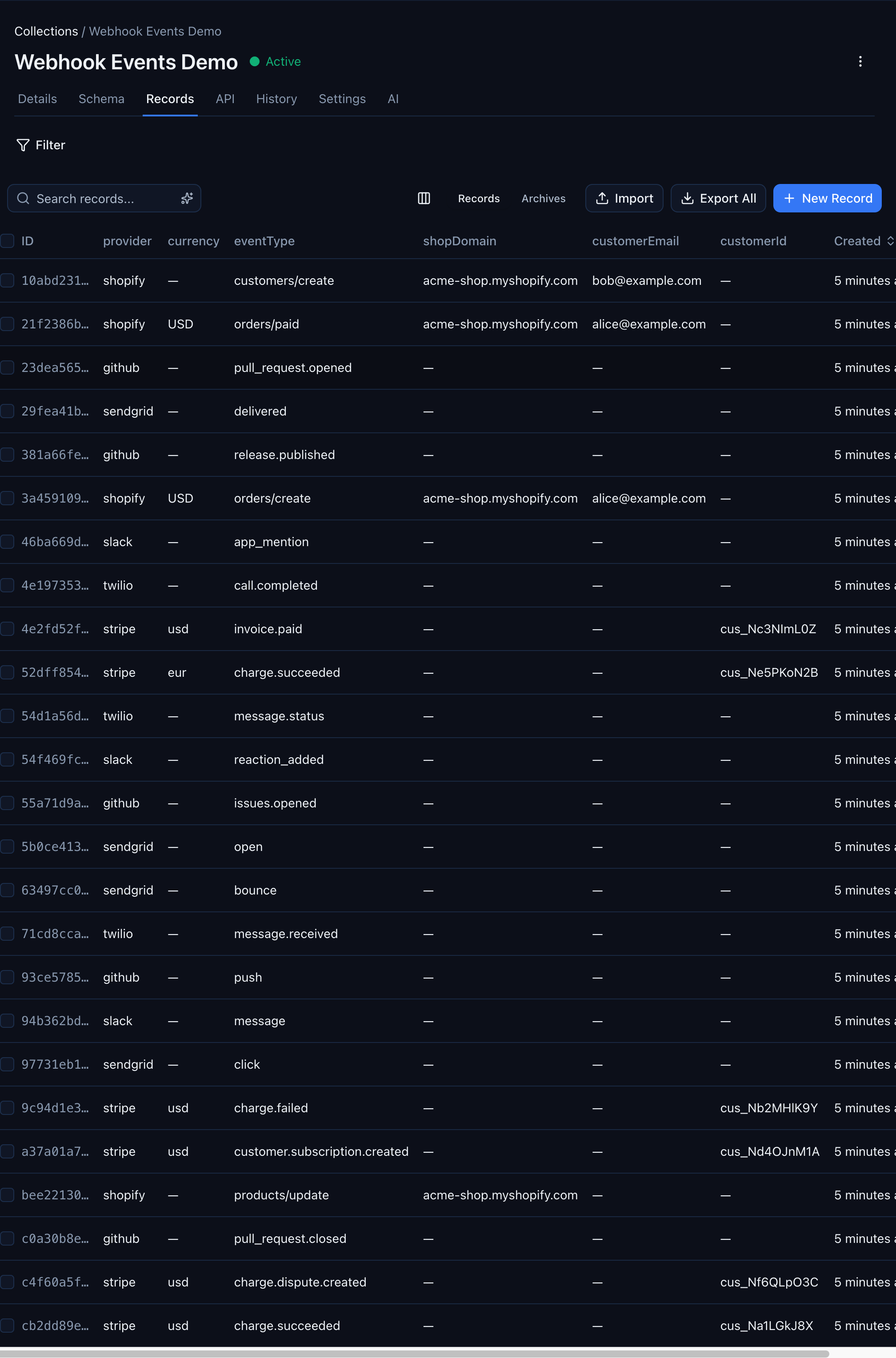 Stripe records show their customerId, Shopify records show their shopDomain and customerEmail, GitHub records show their eventType — all in the same typed grid. No coding, no SDK calls, no manual schema design.