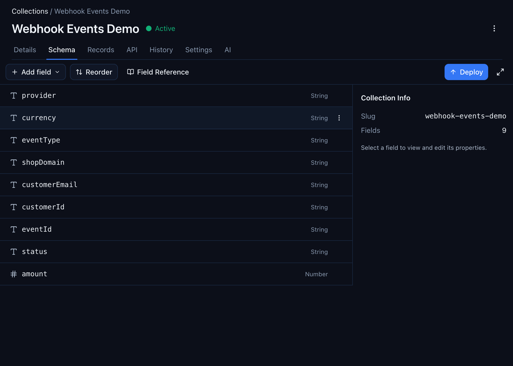 Any schemaless collection with records works. For this walkthrough we'll use a collection called webhook-events-demo that holds 28 webhook events from Stripe, GitHub, Shopify, Twilio, Slack, and SendGrid — each with a different shape. The same flow applies to any schemaless collection, webhook-related or not.