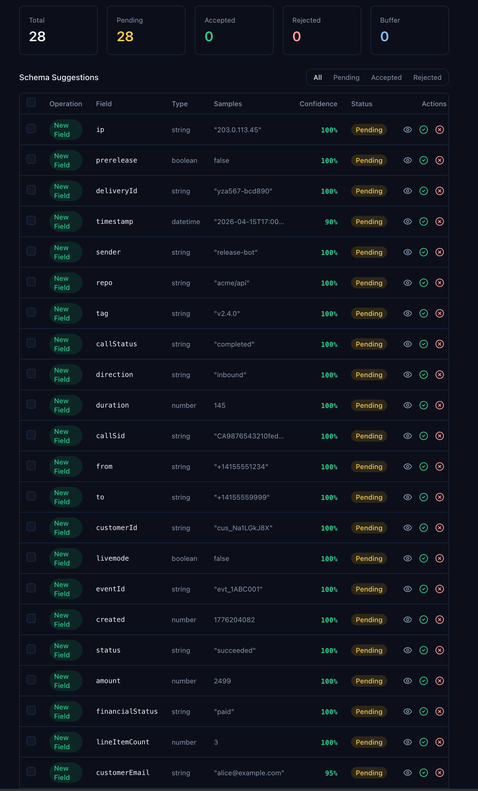 Look at the variety in that table. callStatus from Twilio records. repo from GitHub. financialStatus from Shopify. customerId from Stripe. bounceReason from SendGrid. The scan found every unique field across every provider — 28 records, 28 distinct fields inferred.