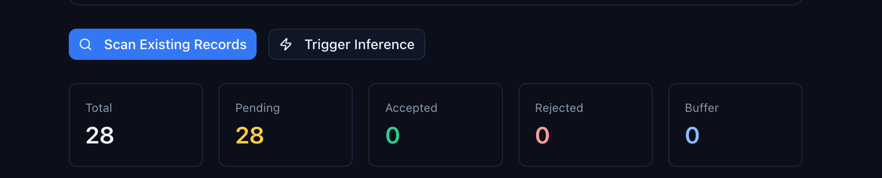 - Action buttons — Scan Existing Records (analyze what's in the database) or Trigger Inference (process buffered records)