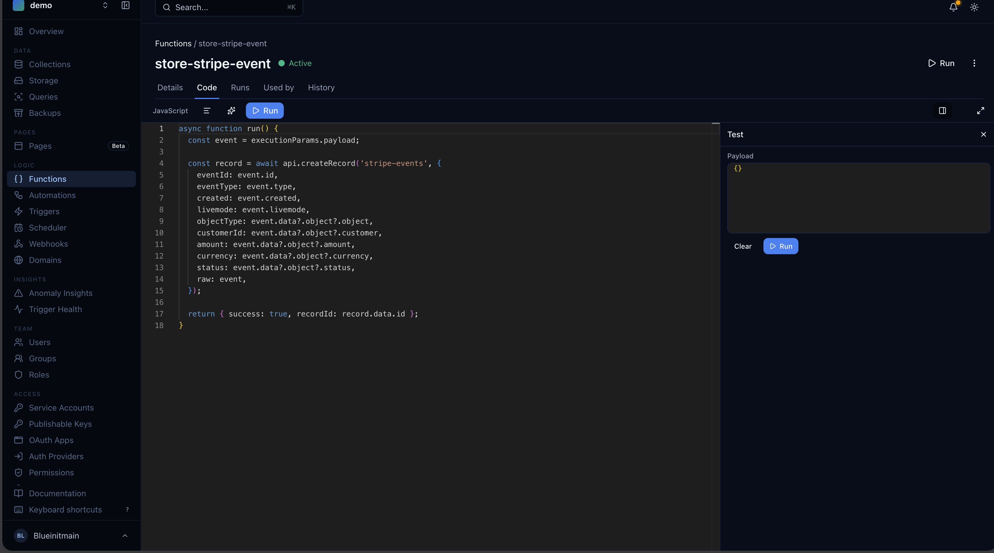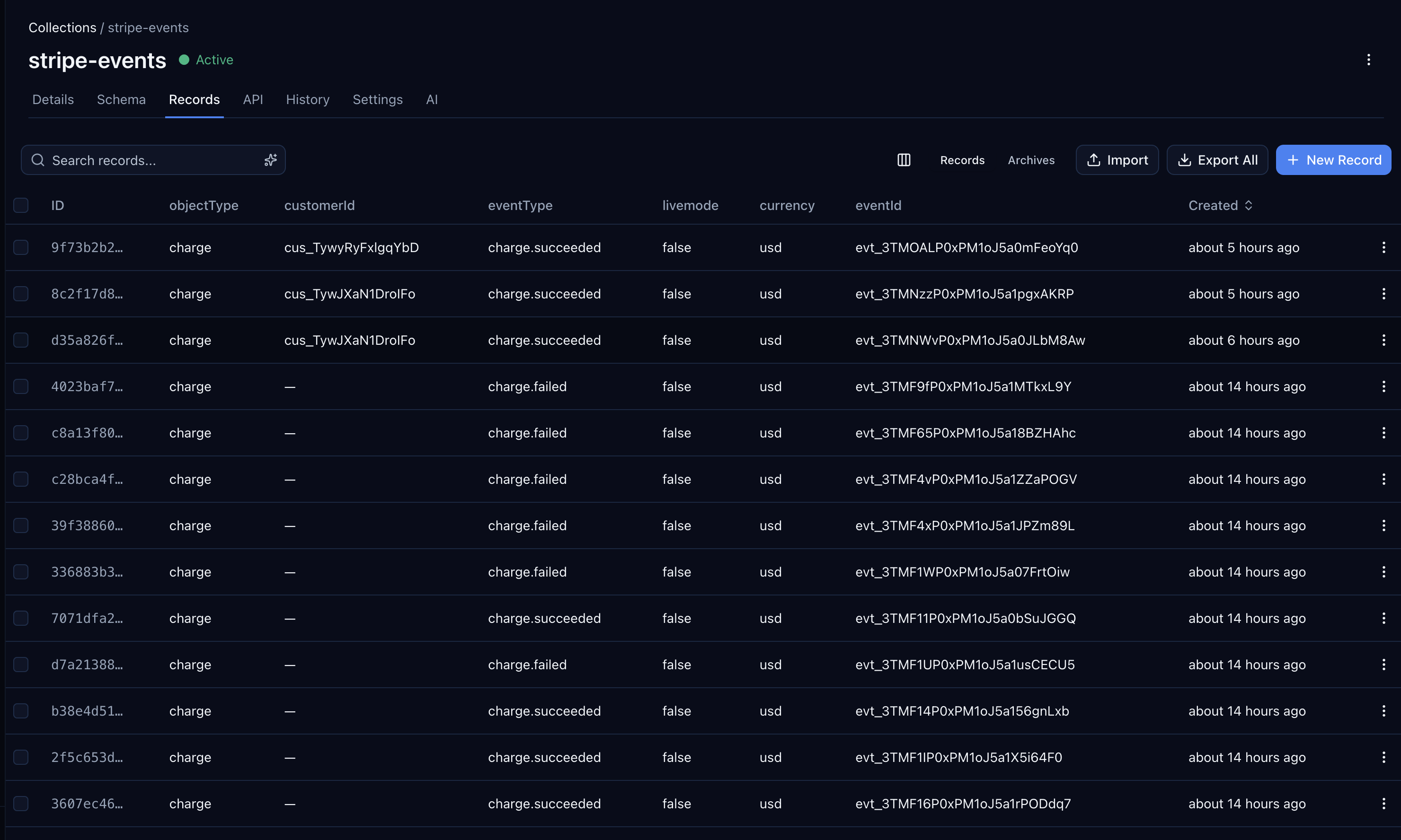 }This function runs every time Stripe sends an event. It flattens key fields (eventType, customerId, amount) to the top level for fast querying and keeps the full payload in raw. You can reshape this however you want — add fields, drop fields, transform values.