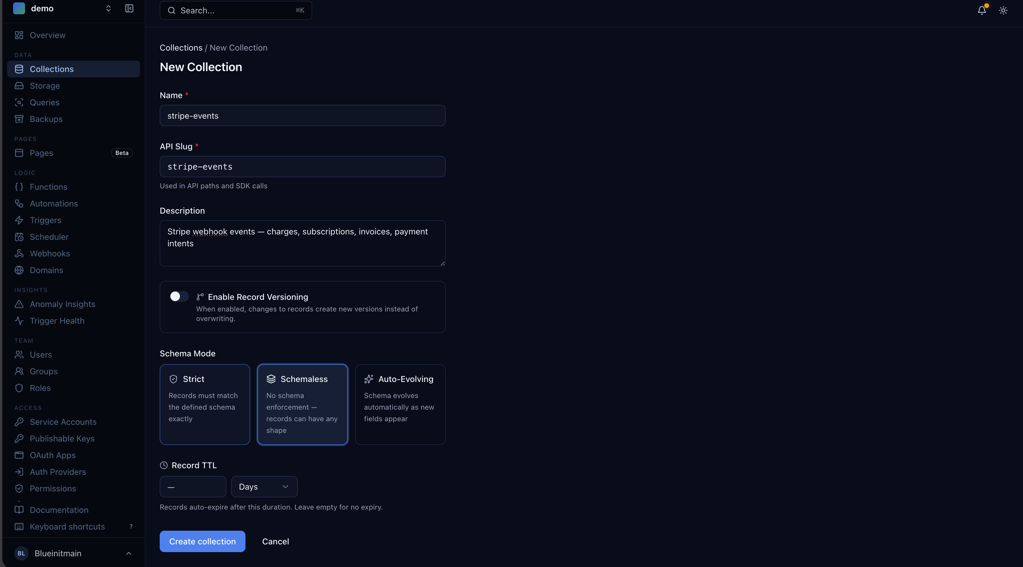 stripe-events is a collection we'll create in a moment. Set it to schemaless mode so it accepts any event shape — charge.succeeded looks nothing like customer.subscription.deleted.