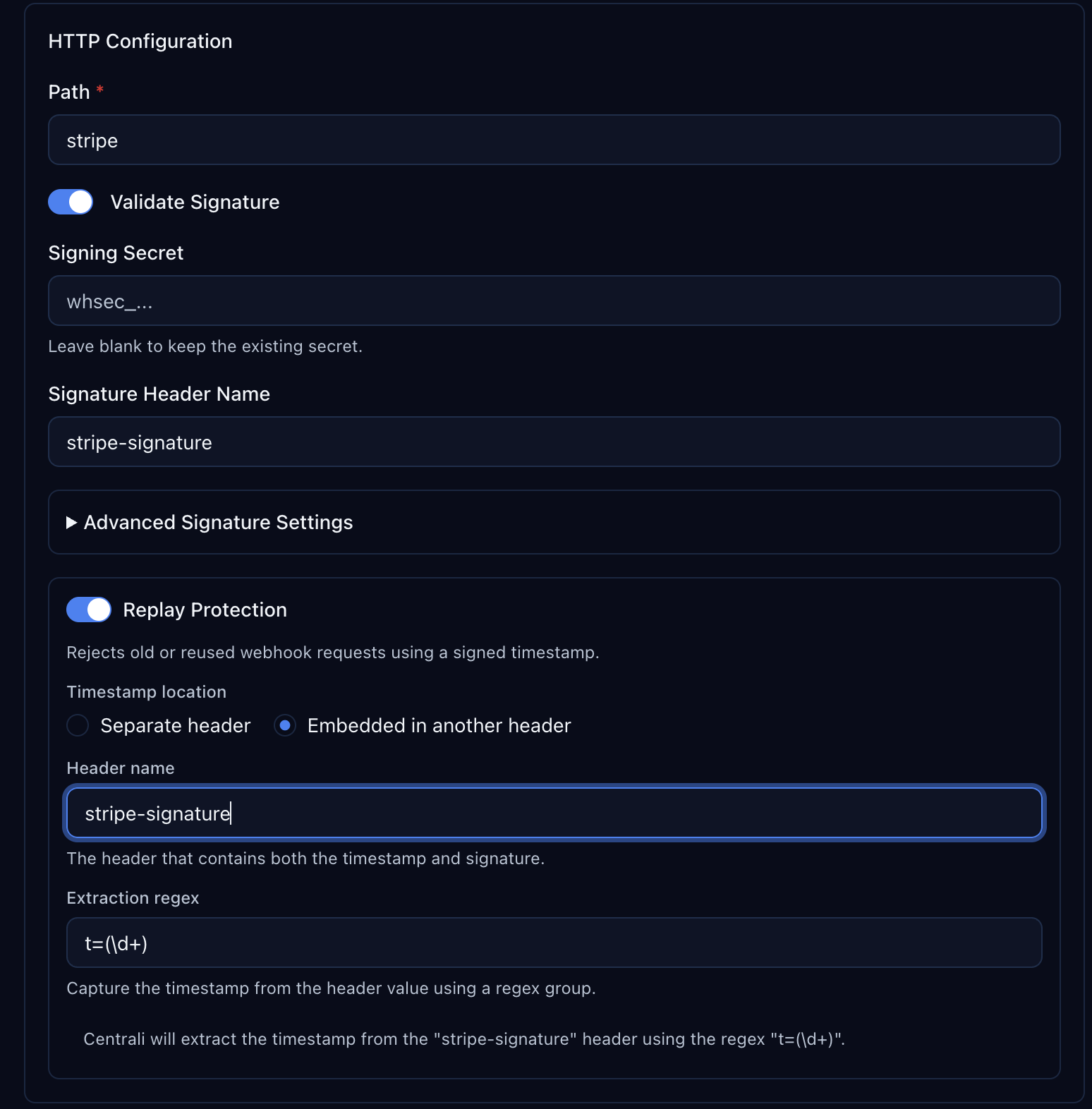 Stripe signs every webhook with HMAC-SHA256 using a compound header: t=1492774577,v1=5257a869.... Configure the trigger to validate it: