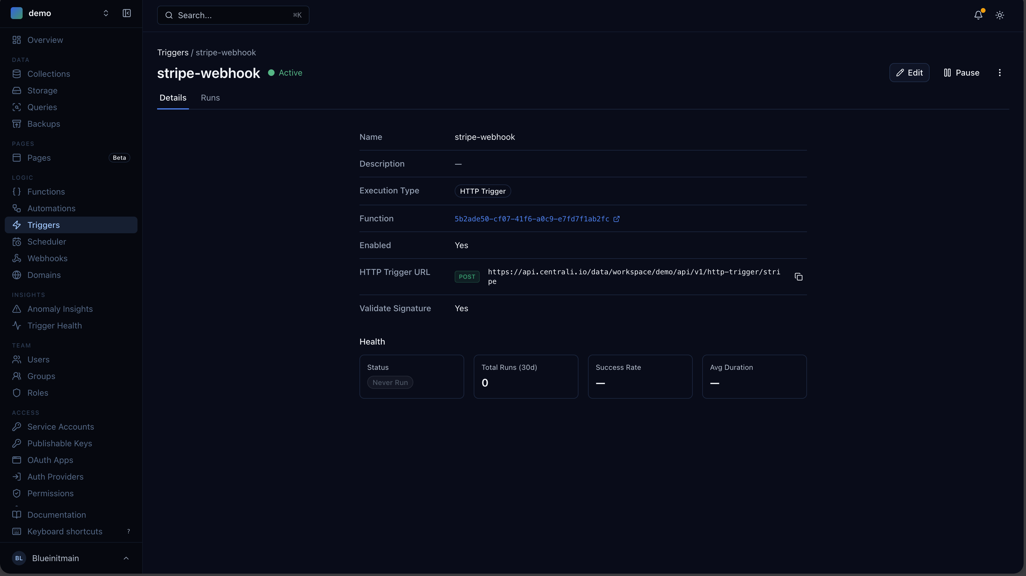 This walkthrough sets up permanent Stripe event storage in Centrali. You'll write a compute function that receives and stores every event, wire it to an HTTP trigger with signature verification, and connect it to Stripe.
